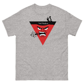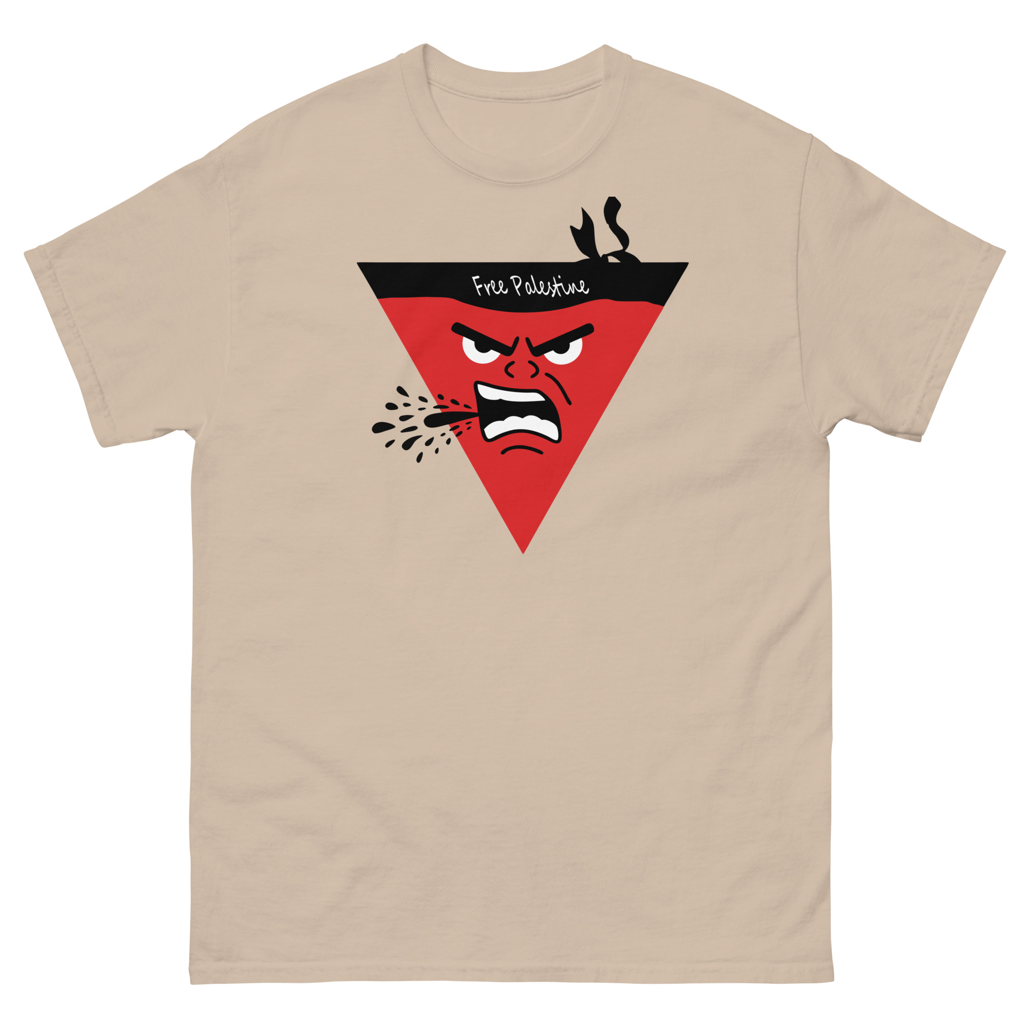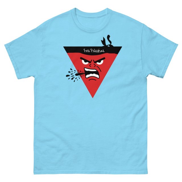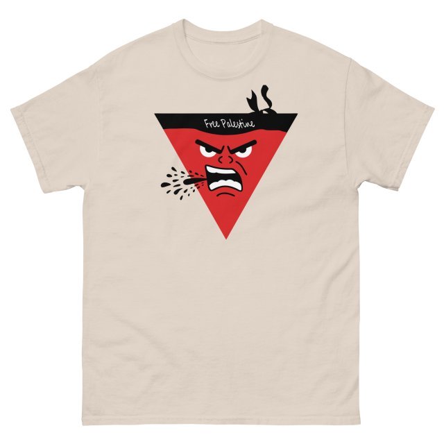 Stand in solidarity with a powerful message. This eye-catching graphic tee features a bold and expressive red triangle character with an intense, determined expression, symbolizing the fight for freedom. The words ‘Free Palestine’ are prominently displayed, making it a statement piece that speaks volumes. Crafted from high-quality, comfortable fabric, this shirt is perfect for anyone who supports the Palestinian cause. Wear it proudly and let your voice be heard.
