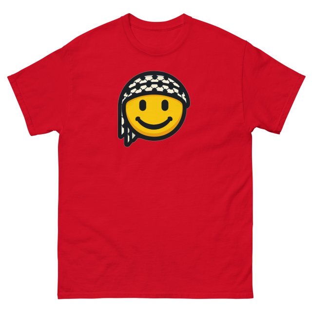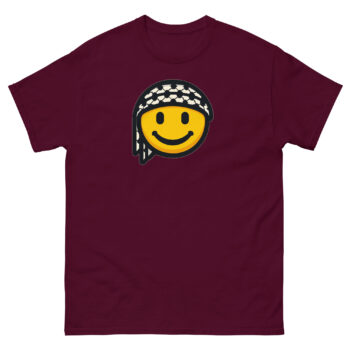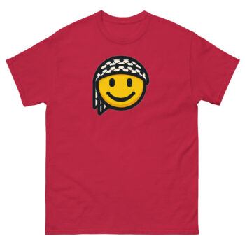 Express your support for Palestine with this eye-catching “Free Palestine” Smiley T-Shirt. Featuring a bright yellow background with a unique smiley face adorned with a keffiyeh, this design combines positivity with a strong message of solidarity. Made from premium, soft cotton, this shirt is perfect for rallies, events, or casual wear. Stand out and show your support for the Palestinian cause in a stylish and meaningful way.